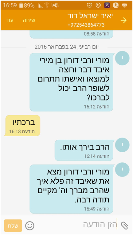 בנוסף, התקשרתי למישהו שמקושר לרב אמרתי לו שאני תורמת עכשיו לשופר ואני רוצה שהרב יברך. באותו זמן שהייתי עם שופר בטלפון הרב שלח הודעה שהוא ברך.