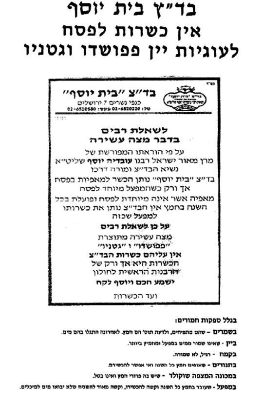 כך פסק הרב יעקב יוסף זצ"ל: "העשיה לא טובה ... חשש על היין נסך ... המסוע לא מהיר". הרב מרדכי אליהו זצ"ל על רכישת מוצרי החברה: "שיש בזה מסייע ביד מחטיאי הרבים". הרב אופיר מלכה: "הגר"ע יוסף זצוק"ל הורה שאין לתת כשרות מהדרין".