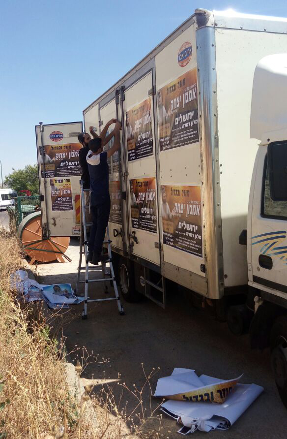 תליית מודעות על המשאית בערב שבת 'בהעלותך':