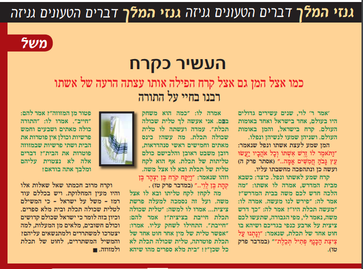 כמו אצל המן, גם אצל קרח הפילה אותו עצתה הרעה של אשתו. [רבנו בחיי על התורה]