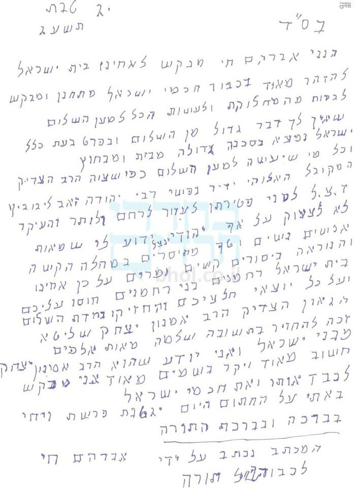 כבוד הרב, מאור עינינו, אין דף, עט ודיו היכולת להכיל את אשר ליבנו מבקש לומר. ב"ה בזכותכם רואים אנו עד כמה גדול אלוקי ישראל, כמה גדול אלוקי הרב אמנון יצחק, יה"ר שהשי"ת ישמרכם מכל מרעין בישין, וכל אויביכם שהם אויבי התורה הקדושה, שיפלו תחת רגליכם, אכי"ר. קשה ועצוב לראות את התופעה של קריעת מודעות, ואי אפשר להתרגל לכך. מר ממש. ואשרי הבחור שמדביק מחדש. כבוד הרב מלמד שאין אדם מלאך – אלא חצי אדם וחצי מלאך. אך כבוד הרב עצמו – אדם כמלאך. אתמול זכיתי למעט ביזיונות. שעת ניסיון קשה מאוד, אך ב"ה בזכותכם נשארתי שפויה לגמרי. יהי רצון שבזכות הבזיון שקבלתי ונתתי ברכת הדיוט למשפחה שהגיעה מרחוק לישועה – שיהיו להם בשורות טובות. בשורה משמחת נוספת, גיסי הניח ציצית ובירך, ואשתו ואנשים מסביב שמחו מאוד וענו אמן. ועוד כמה דברים יפים אירעו ביום שני. האוכל של א. מ. מטובל בטוב טעם ונדיבות, יה"ר שימשיכו ויצליחו, אמן. שוב אודה לכבוד הרב ולכל העמלים במלאכה – יהי רצון שהשם יתברך יגשים כל משאלות ליבכם לטובה. ותודה מיוחדת גם לרבנית היקרה, שאם לא אודה לה – הרי זו כפיות טובה ממש. ודבר אחרון היום בבוקר עברנו מהמקום, ששמו שלט ענק של מורינו והלב היה מלא שמחה לראות. יה"ר שנזכה ברחמים לקבל פני משיח צדקנו במהרה, אמן.