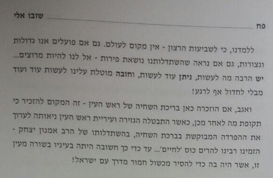 מאמר בספר 'שובו אלי' המדבר על חשיבות ההשתדלות וכמה מוטל לעשות עוד ועוד מבלי לחדול לרגע, מביא דוגמא מרבנו שליט"א על השתדלותו למנוע פתיחת בריכת שחיה מעורבת בראש העין.