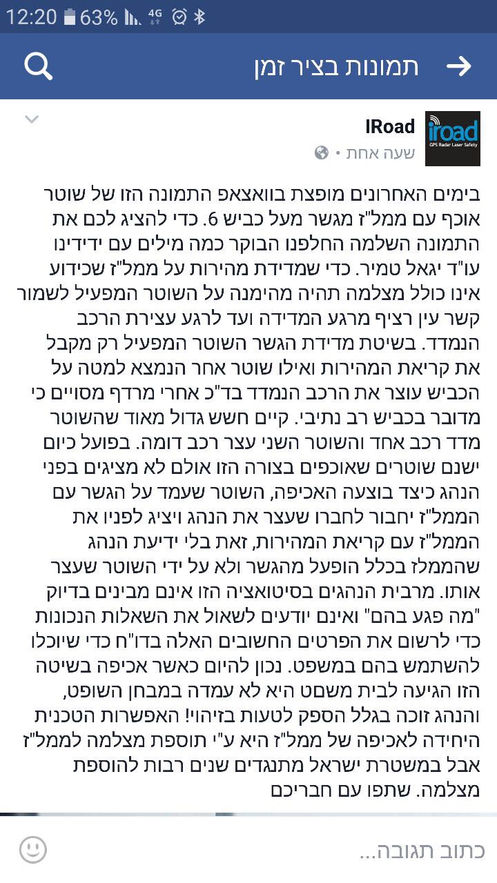 האפשרות הטכנית היחידה לאכיפה של ממל"ז היא ע"י תוספת מצלמה לממל"ז אבל במשטרת ישראל מתנגדים שנים רבות להוספת מצלמה. שתפו עם חבריכם (צילום מסך של ההודעה)