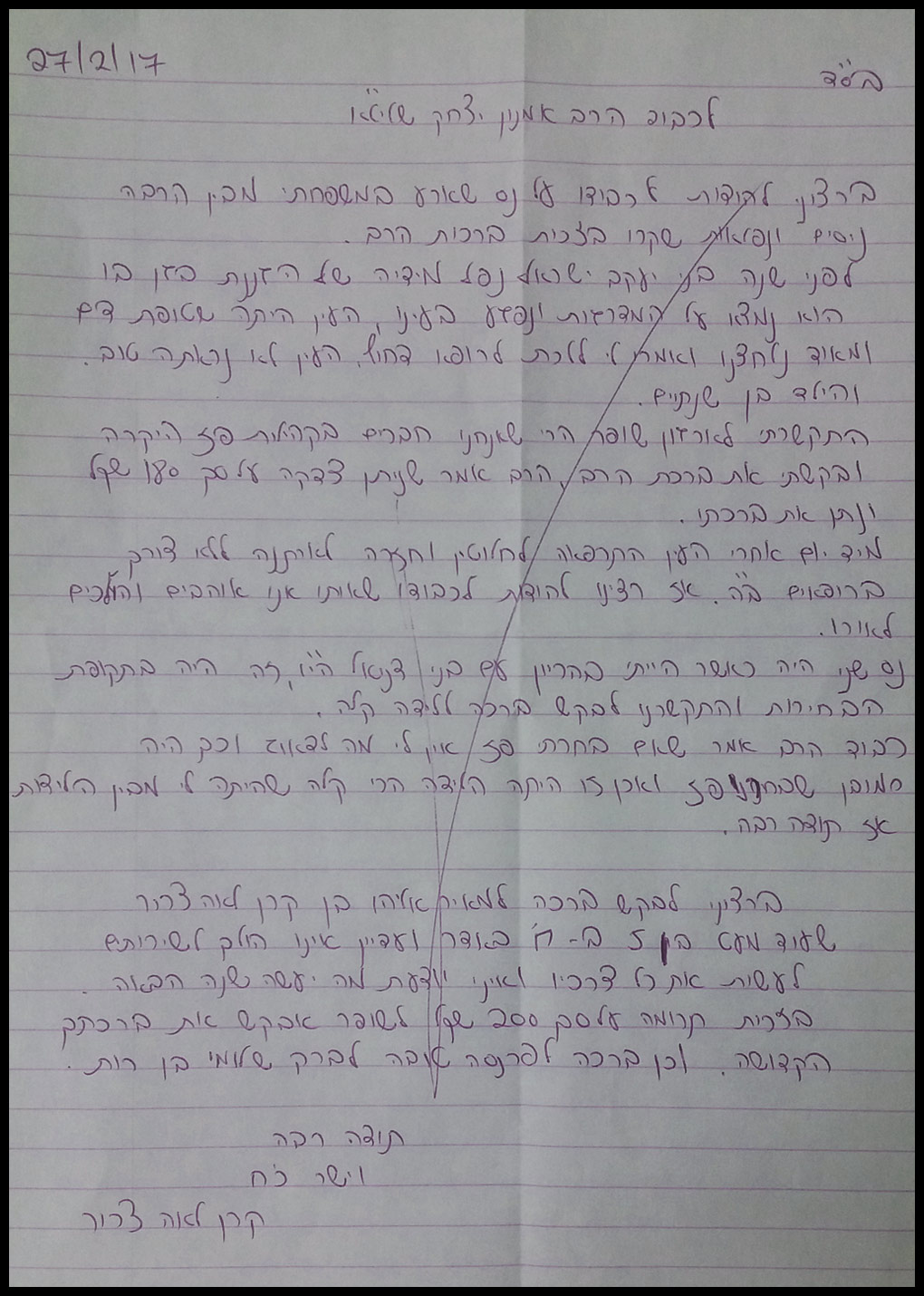 מכתב תודה לרב אמנון יצחק על הנסים וישועות במשפחה