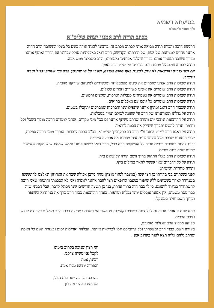 מכתב תודה לרב אמנון יצחק שליט"א