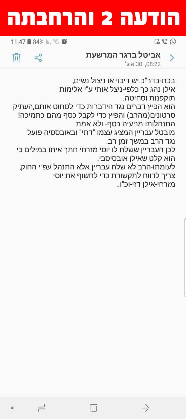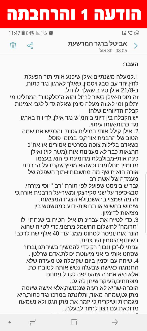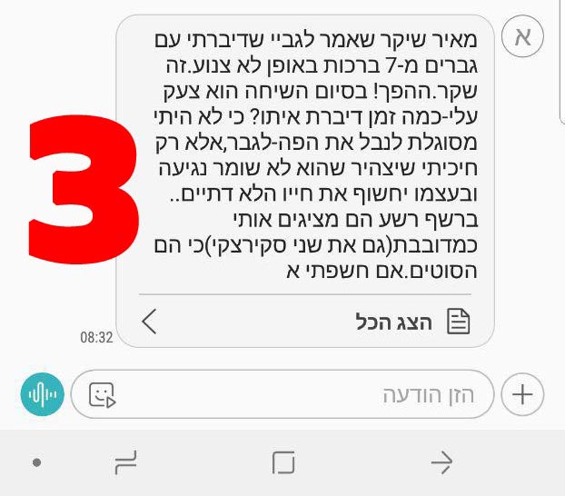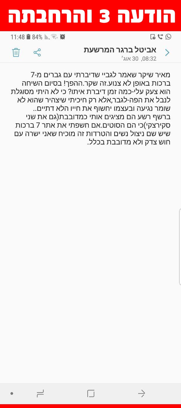 כבוד הרב היקר שליט"א, בוקר טוב ושבוע טוב ומבורך! תודה רבה אין סופית על דבריכם הבוקר בעניין האיפור ותכשיטים של הנשים לרשות הרבים! בעזהשי"ת זה יתן כוחות עצומים לנשים להתגבר על היצר הרע ולמאוס בזה עוד יותר כשישמעו את דברי כבוד הרב היקר שליט"א!!!! זה יתן פוש רציני לכולן וכוח גדול להצליח להביא להשראת השכינה בעזרת השם יתברך בעם ישראל לקראת חג הפסח! יהי רצון שנזכה להיגאל ברחמים סוף סוף בפסח הקרוב השנה! "וְהָיָה מַחֲנֶיךָ קָדוֹשׁ..." (דברים כג, טו) תבורכו משמים בכל הברכות הקיימות בעולם! אמן ואמן, היום כל ירושלים נצבעת במודעות הצניעות במגזינים שיכנסו לכל בית בעזרת השם יתברך! אלפים אלפים של בתים יקראו את מודעת הצניעות היום! ויהי רצון שיתעוררו לעשות את רצון השם יתברך כרצונו אמן ואמן.