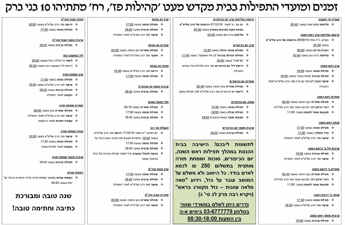זמנים ומועדי התפילות לחגי תשרי בבית מקדש מעט 'קהילות פז'