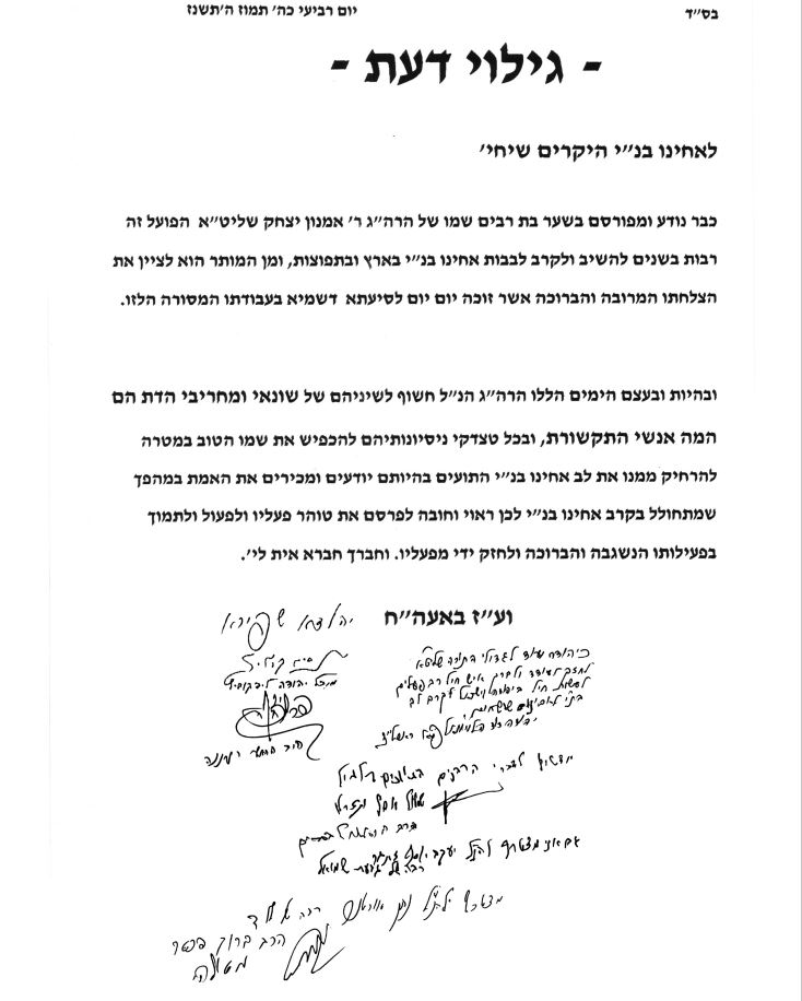 גילוי דעת - מכתבי הרבנים וחתימותיהם כדלהלן:
