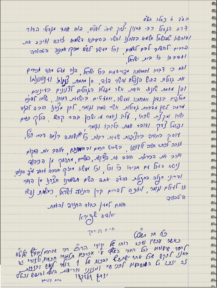 מכתב בכתב יד של הרה"ג הרב יהודה שפירא זצוק"ל לרב אמנון יצחק שליט"א משנת 2001!
