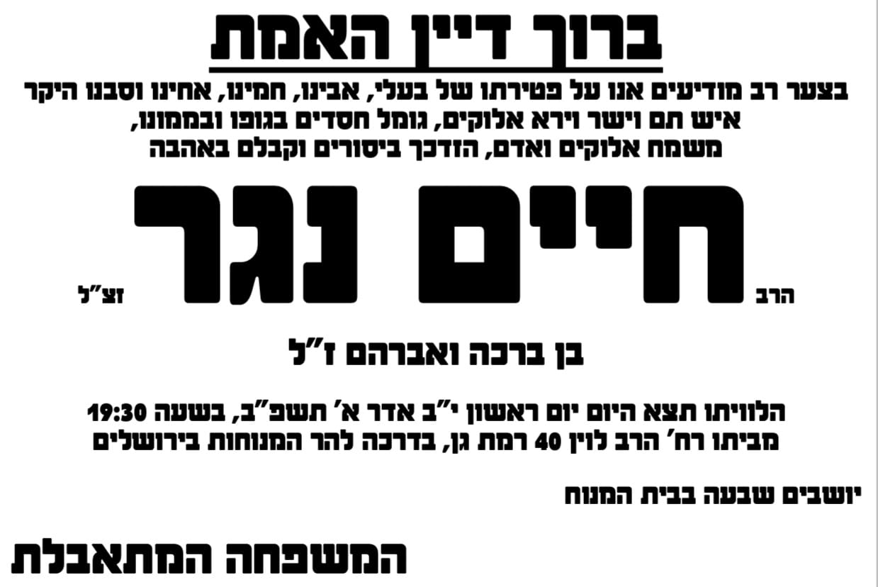 עצרת התעוררות ומספד במלאת השבעה לר' חיים נגר ז"ל