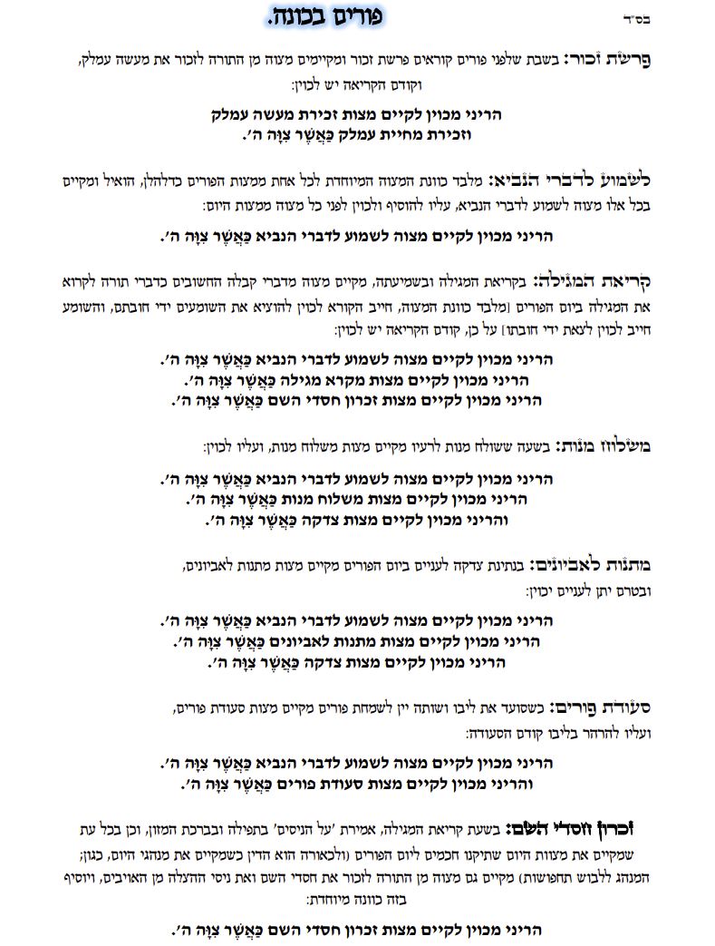 לשמוע לדברי הנביא: מלבד כוונת המצוה המיוחדת לכל אחת ממצות הפורים כדלהלן, הואיל ומקיים בכל אלו מצוה לשמוע לדברי הנביא, עליו להוסיף ולכוין לפני כל מצוה ממצות היום:
