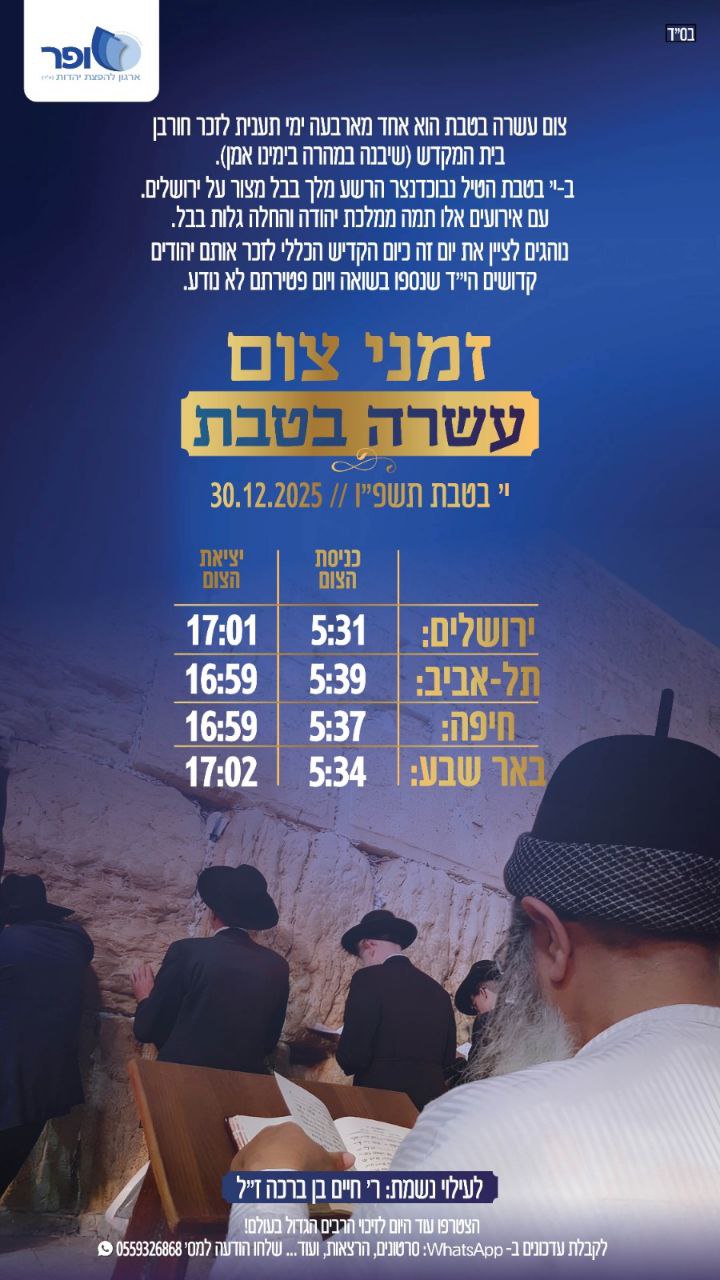 פורסם בתאריך: 06.07.2023, 17:25 • מערכת שופרזמני צום עשרה בטבת תשפ"ו (עשרה בטבת) יה"ר שיהפכו השי"ת לטובה - אמן!