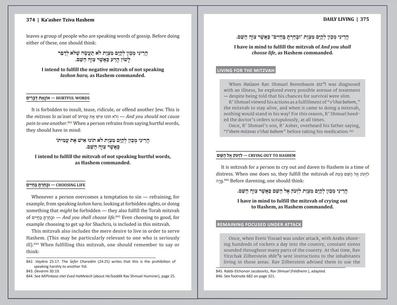 צריך לזכור: 'הריני מכוון לקיים מצוות לא תעשה "וְלֹא תוֹנוּ אִישׁ אֶת עֲמִיתוֹ" כאשר ציוה ה''. כי אני מתכוון לקיים את המצווה שלא לדבר מילים פוגעות, כפי שציווה ה'.