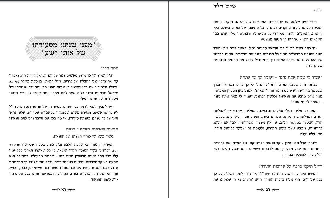 ובמאמר זה ידובר על: "מפני שנהנו מסעודתו של אותו רשע" תמצית שאיפות האדם - הנאה | "אמור לי ממה אתה נהנה - ואומר לך מי אתה"! | חז"ל תיקנו ברכה על עריבות התורה! | אסתר תיקנה תענית - לתקן את ההנאה מסעודתו של אותו רשע | התביעה על עם ישראל - מה גורם להם הנאה? | "וְלֹא רָאָה עָמָל בְּיִשְׂרָאֵל" (במדבר כג, כא) - הצדיקים אינם מרגישים עמל | "וְלֹא אֹתִי קָרָאתָ יַעֲקֹב - כִּי יָגַעְתָּ בִּי יִשְׂרָאֵל" (ישעיהו מג, כב) | החשק וההנאה מעניקים כוחות עילאיים! | 'וְחַיֵּי צַעַר תִּחְיֶה' (אבות ו, ד) - בכל דבר אחר חוץ מהתורה | מפני מה צהבו פניו של רבי יהודה בר אלעאי?... | איזה אוצר מצא רבי אבהו?... | "אנא תפילין מנחנא"! | מפני מה פצח החפץ חיים ז"ל בריקוד? | מרן הרב שך זצ"ל: "ילד מוכרח לשחק"! | ה"משחקים" של הגאון רבי חיים קניבסקי שליט"א בילדותו... | "הַנֶּחֱמָדִים מִזָּהָב וּמִפַּז רָב וּמְתוּקִים מִדְּבַשׁ וְנֹפֶת צוּפִים" (תהלים יט, יא) | "תוֹרָתְךָ שַׁעֲשֻׁעָי"... (תהלים קיט, צב) | כיצד יש אשר אינם חשים במתיקות התורה? | הכל תלוי באדם האוכל... | התורה משולה לחבית מלאה דבש | הדרך להשיג מתיקות התורה: עמל התורה! | למי הם מתוקים? למי שמוסר נפשו עליהם! | "אוֹרָה" (אסתר ח, טז) - 'זו תורה!'