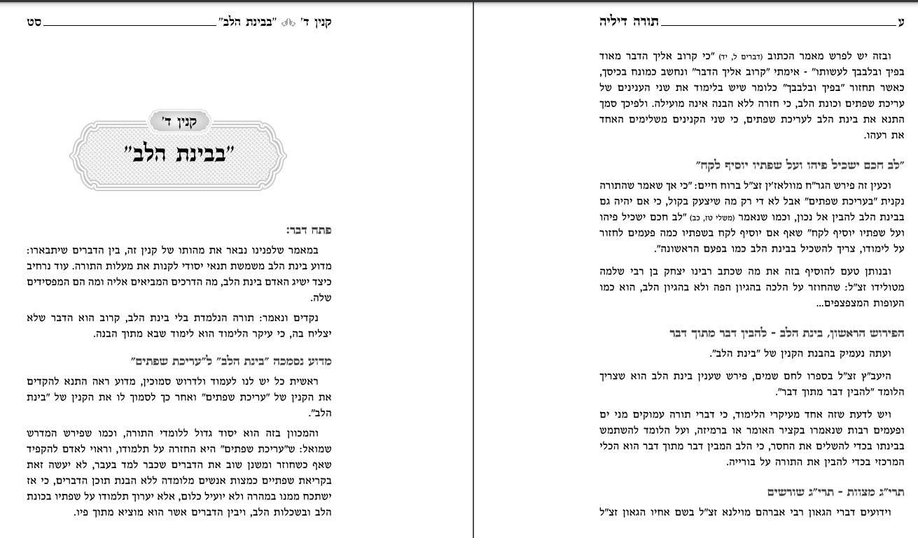 ובזה יש לפרש מאמר הכתוב (דברים ל, יד) "כי קרוב אליך הדבר מאוד בפיך ובלבבך לעשותו" - אימתי "קרוב אליך הדבר" ונחשב כמונח בכיסך, כאשר תחזור "בפיך ובלבבך" כלומר שיש בלימוד את שני הענינים של עריכת שפתים וכונת הלב, כי חזרה ללא הבנה אינה מועילה. ולפיכך סמך התנא את בינת הלב לעריכת שפתים, כי שני הקנינים משלימים האחד את רעהו.