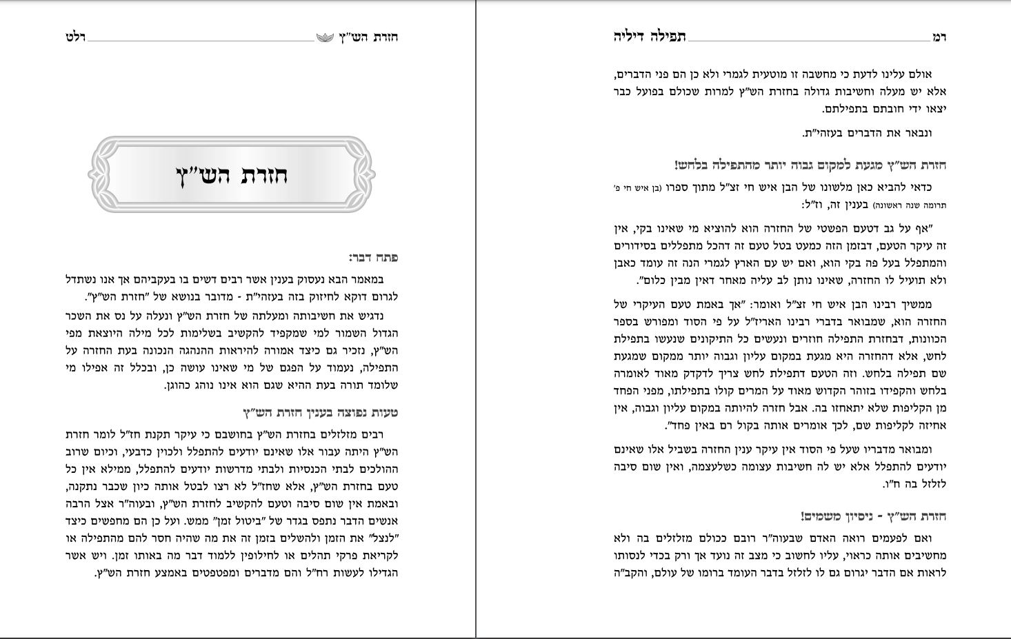 נדגיש את חשיבותה ומעלתה של חזרת הש"ץ ונעלה על נס את השכר הגדול השמור למי שמקפיד להקשיב בשלימות לכל מילה היוצאת מפי הש"ץ, נזכיר גם כיצד אמורה להיראות ההנהגה הנכונה בעת החזרה על התפילה, נעמוד על הפגם של מי שאינו עושה כן, ובכלל זה אפילו מי שלומד תורה בעת ההיא שגם הוא אינו נוהג כהוגן.