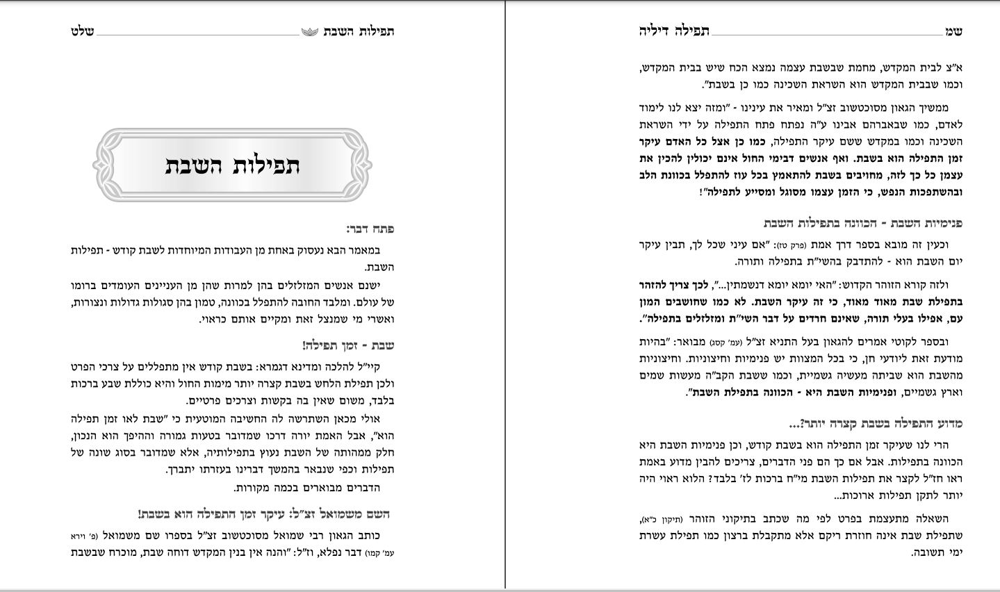 "עיקר כח התפילה הוא בשבת קודש, ומי שמתפלל בשבת כדבעי אז מובטח לו שתתקבל תפילתו. ויש לזה רמז, כי שבת ר"ת - ת'פילתי ש'גורה ב'פי. וידוע מה שאמרו חז"ל במסכת ברכות (דף לד:) "אם שגורה תפילתי בפי - יודע אני שהוא מקובל"...
