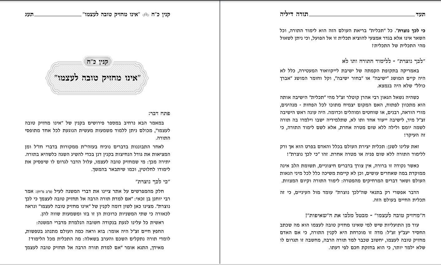 מספר פירושים בקנין 'אינו מחזיק טובה לעצמו' שניתן ללמוד משמעות מעשית הנוגעת לכל אחד מתופסי התורה. לאחר התבוננות נוכיח ממקורות ומהמציאות את גודל הנחיצות בקנין דנן בכדי להשיג השגה כלשהיא בתורה. יתירה מכך: מי שמחזיק טובה לעצמו, עלול הדבר לגרום לו ששיפסיק את לימודו לחלוטין, וכמתבאר.