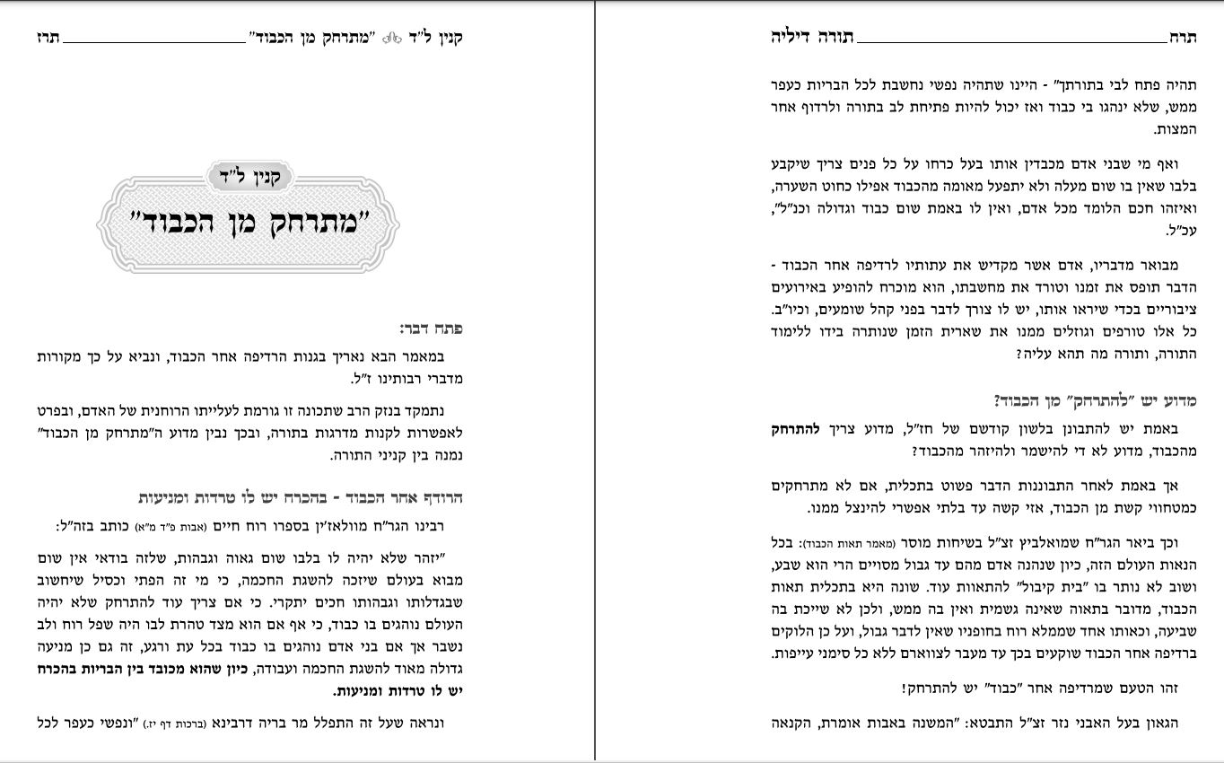 במאמר הבא נאריך בגנות הרדיפה אחר הכבוד, ונביא על כך מקורות מדברי רז"ל. נתמקד בנזק הרב שתכונה זו גורמת לעלייתו הרוחנית של האדם, ובפרט לאפשרות לקנות מדרגות בתורה, ובכך נבין מדוע ה"מתרחק מן הכבוד" נמנה בין קניני התורה.