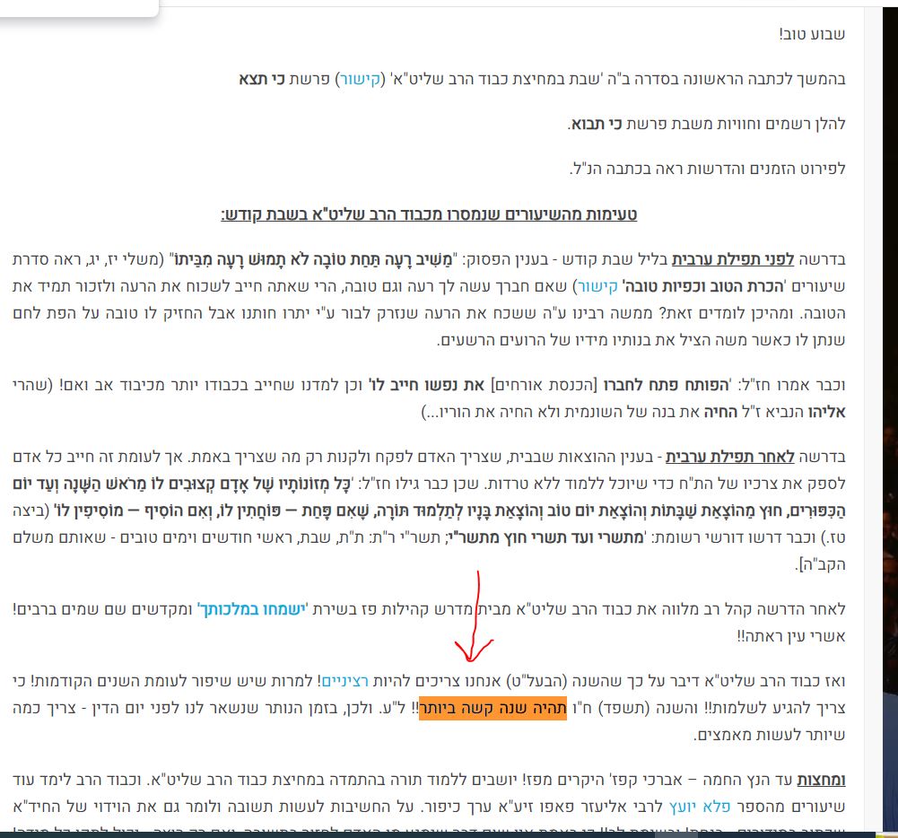 (ראה ציטוט מדברי קדשו: 'שנה קשה ביותר!' בכתבת סיקור פרשת כי תבוא)