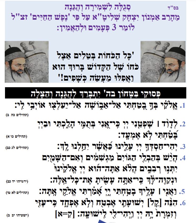 גם חולה מסוכן יכול לקום מחוליו ולהיות בריא ושלם, אם יפסיק לבטוח בבני אדם ויקבע עמוקות בלבו שרק הקב"ה עושה ויעשה לכל המעשים ו: "אֵין עוֹד מִלְבַדּוֹ" (דברים ד, לה) שום כח בעולם.