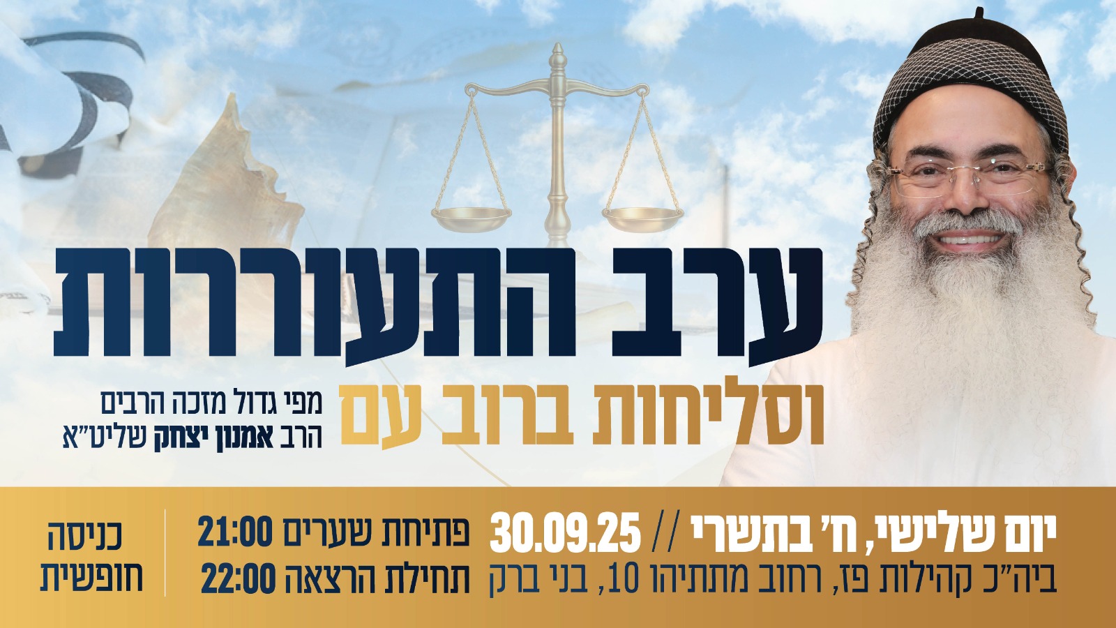 תזכורת: מחר שלישי הרצאה בני ברק 24 שעות לפני יום הכיפורים הבעל"ט!