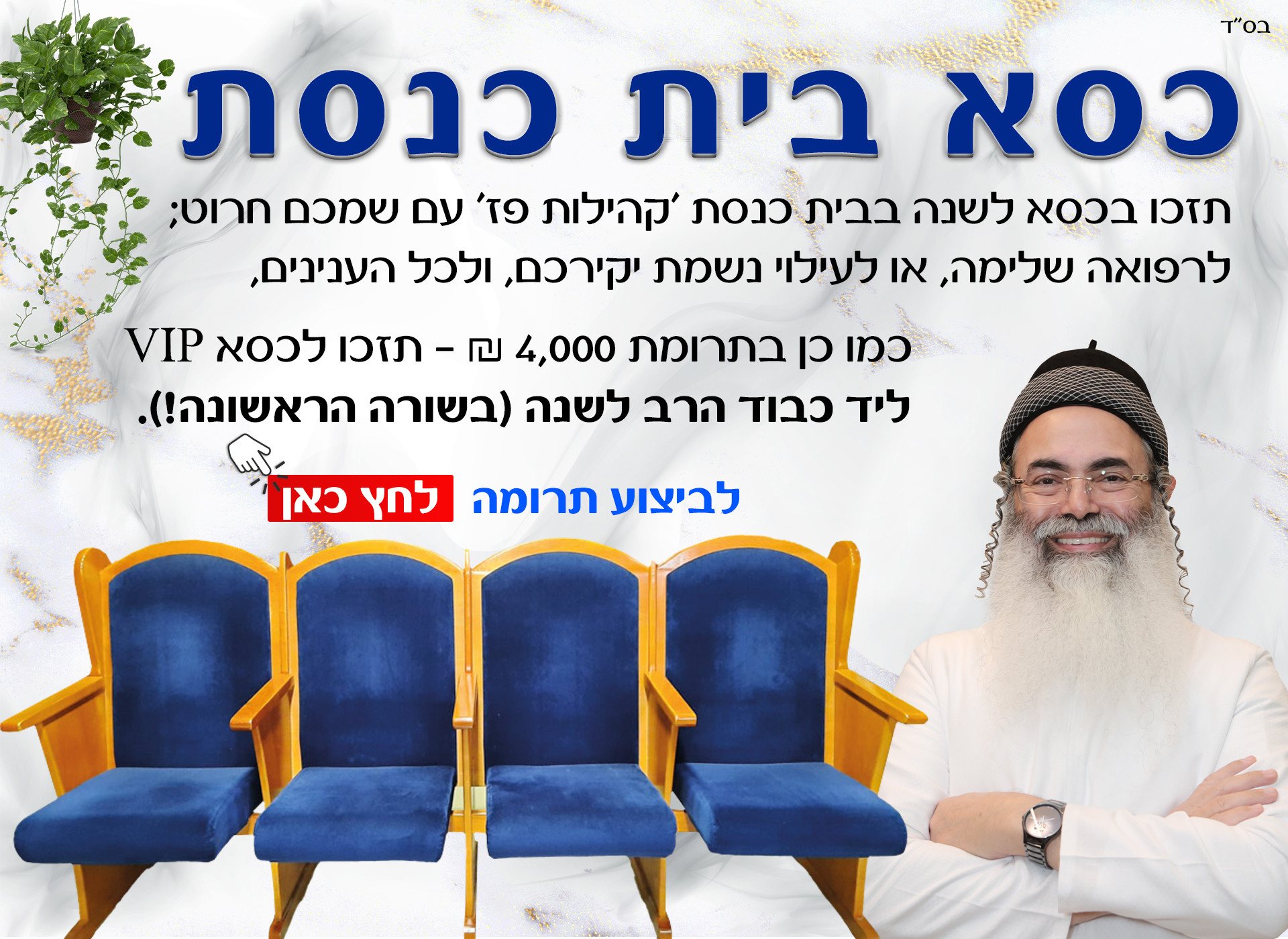 כסא בית כנסת – בתרומת 2,000 ₪ - תזכו בכסא לשנה בבית כנסת 'קהילות פז' עם שמכם חרוט; לרפואה שלימה, או לעילוי נשמת יקירכם, ולכל הענינים, כמו כן בתרומת 4,000 ₪ - תזכו לכסא VIP ליד כבוד הרב לשנה (בשורה הראשונה!).