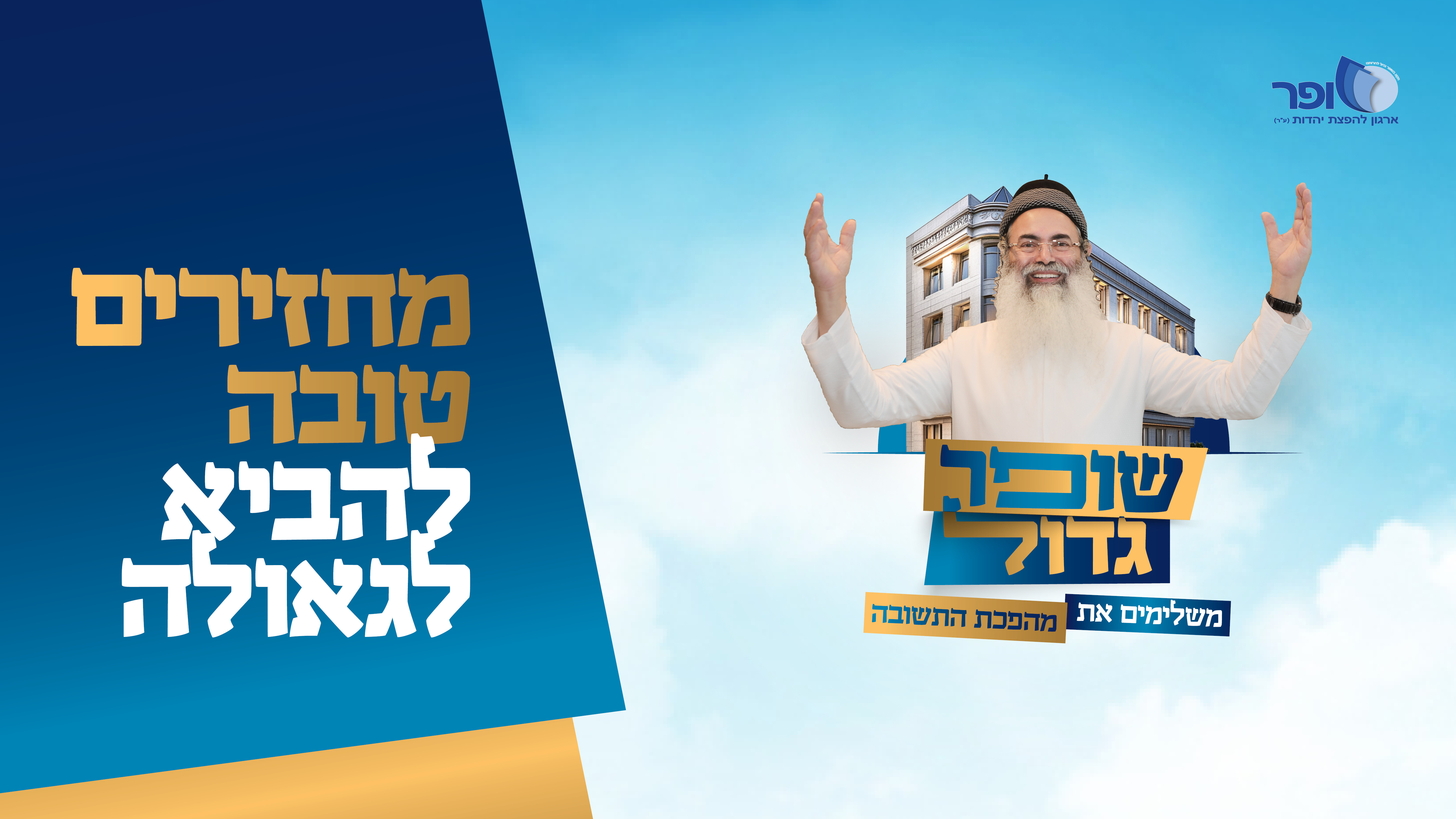 משלימים את מהפכת התשובה מחזירים טובה וזוכים לישועה! הרגעים הגדולים חרוטים לכולנו בלב. קולו של מורנו הרב אמנון יצחק שליט"א מהדהד בלבבות כולנו. הקול שגילה לנו את הדרך שהראה לנו את האור. קול השופר שהחזיר אותנו בתשובה! 40 שנה אחרי שהחלה מהפכת התשובה העצומה. אנו נקראים אל הדגל – להשלים את המהפכה! רגע לפני ביאת המשיח, בשעה הקשה בתולדות עם ישראל יש לנו את הזכות להשלים את תיקון העולם. יחד נקים את בית שופר בירושלים. ממנו תצא תורה וממנו תושלם מהפכת התשובה. יחד נחזיר את הנשארים אל חיק אביהם שבשמים. יחד נחזיר טובה ונזכה לישועה! לקראת ראש השנה תשפ"ה. זכינו לקבל הזדמנות נדירה לזכויות של נצח. כל התורה. כל החיזוקים. כל התשובה. של רבבות יהודים בכל השנים הבאות כל זה יעמוד לנו ביום הדין להכתב לחיים טובים את כל החיים הרוחניים לדורי דורות אנו חייבים לארגון הקדוש – שופר עכשיו אנחנו שותפים בהשלמת המהפכה תורמים. בונים. שותפים. עכשיו!>>