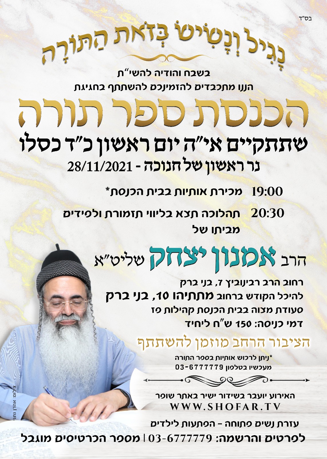 השיעור נמסר במסגרת 'הכנסת ספר תורה' שהתקיימה בס"ד בנר ראשון של חנוכה כד' כסלו תשפב' 28-11-2021