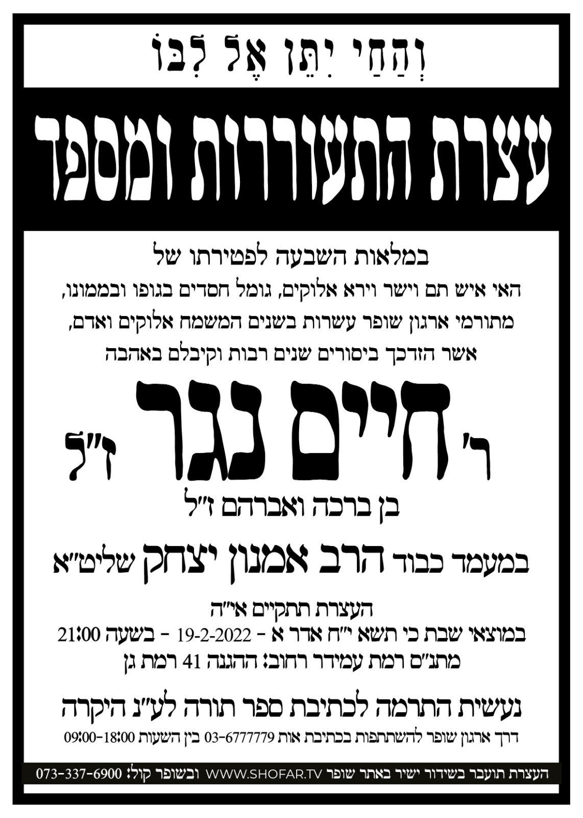 עצרת התעוררות ומספד במלאת השבעה לר' חיים נגר ז"ל